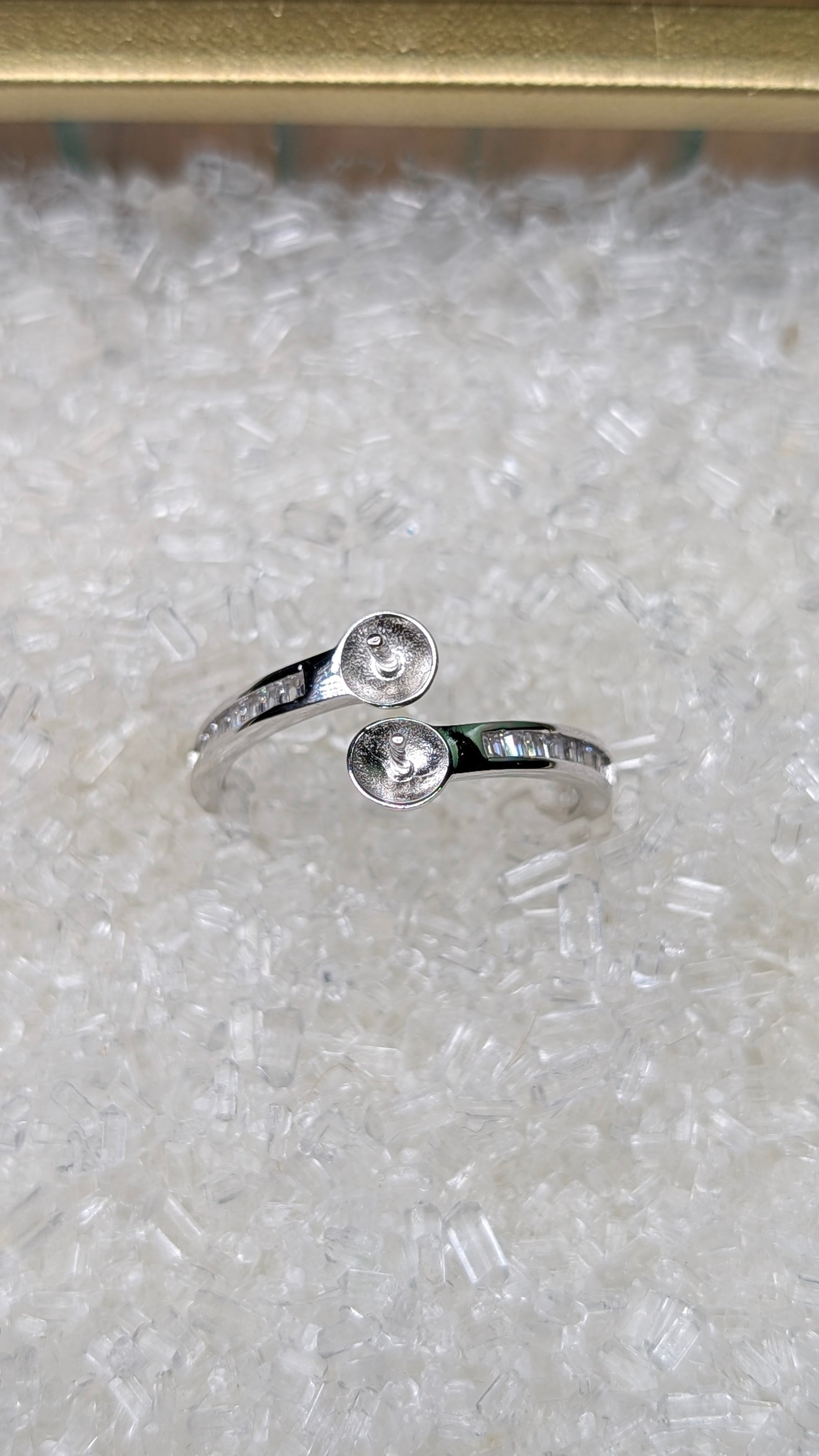 This sterling silver ring holds 2 round pearls with zirconia accent stones on each side. The ring is adjustable to fit any finger.