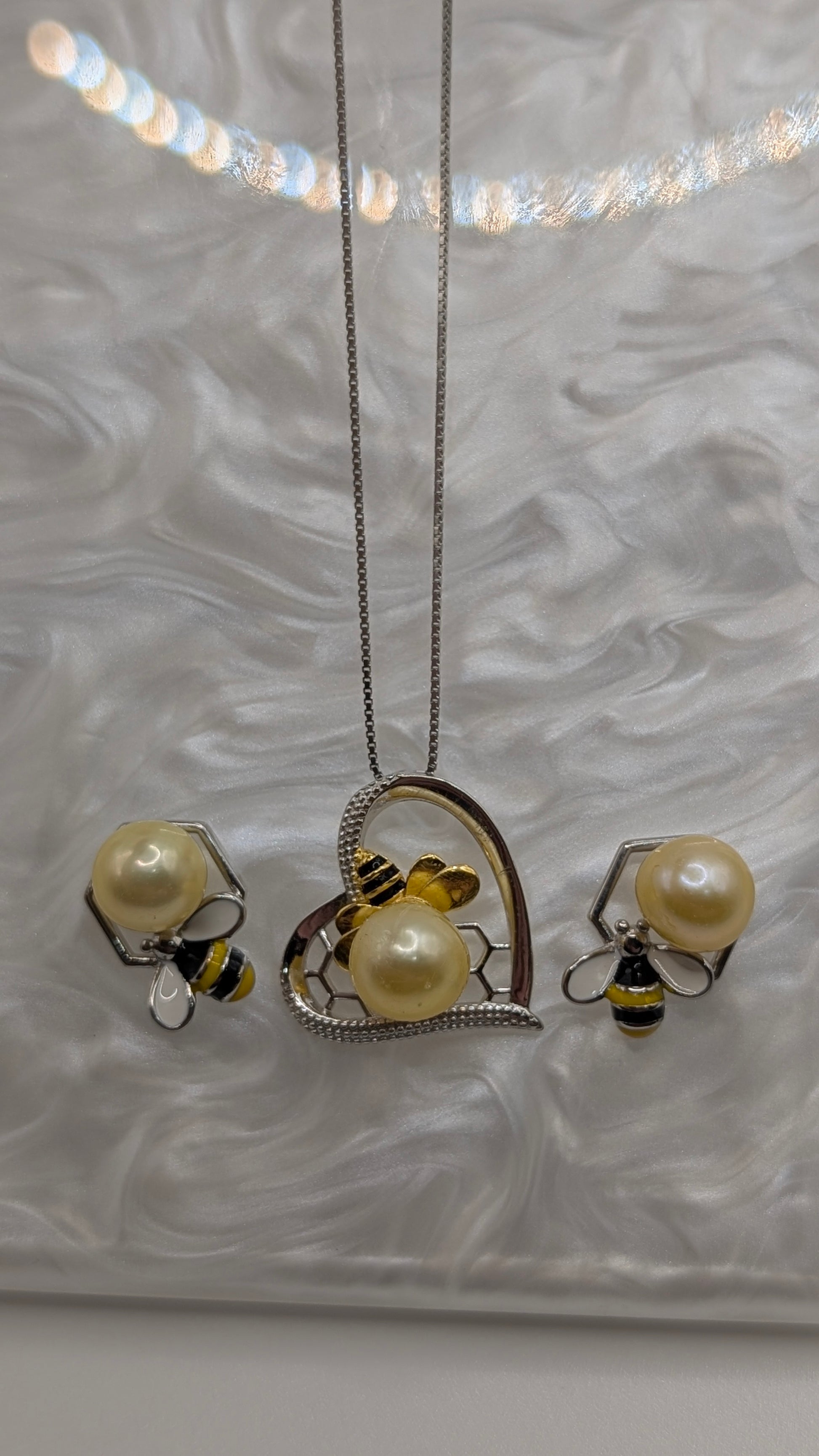 Lemon yellow trio of pearls mounted in our bee necklace pendant and bee earrings, all sterling silver and necklace comes with sterling silver chain