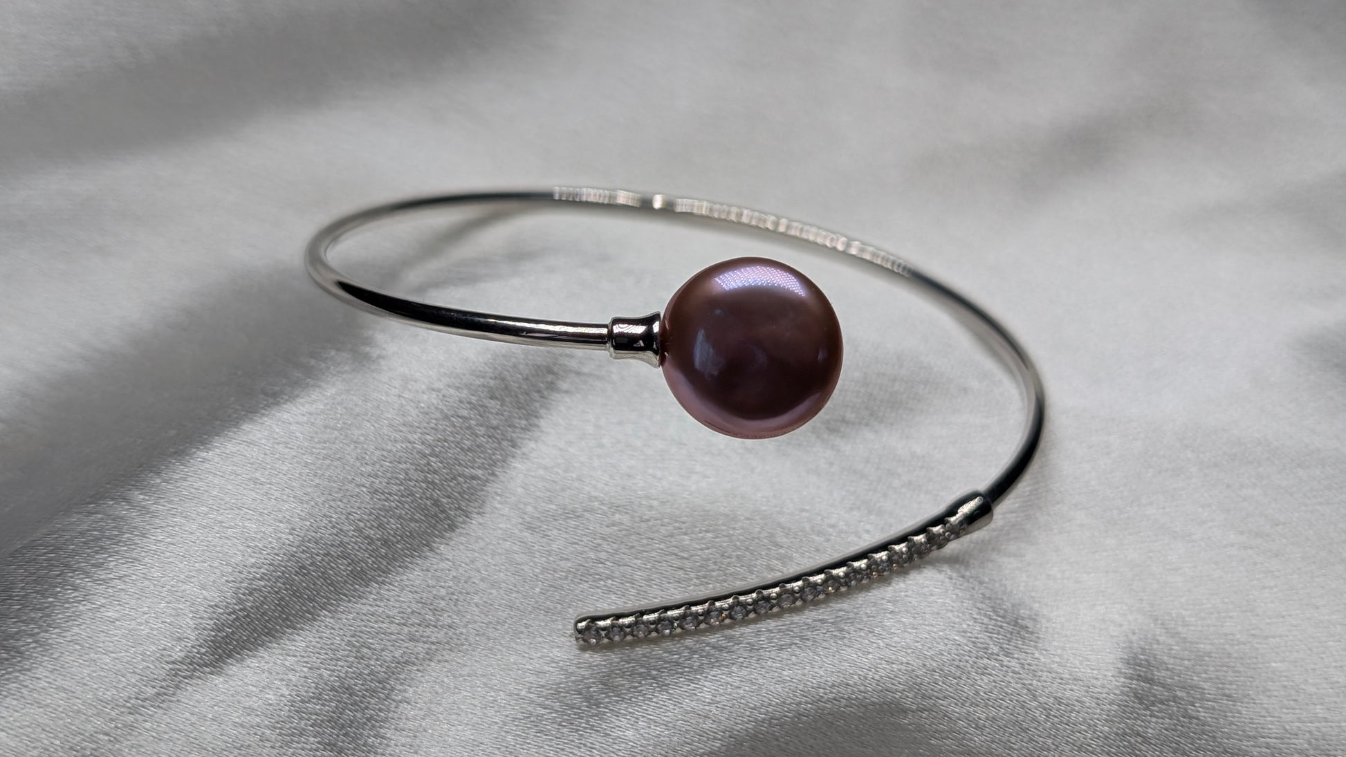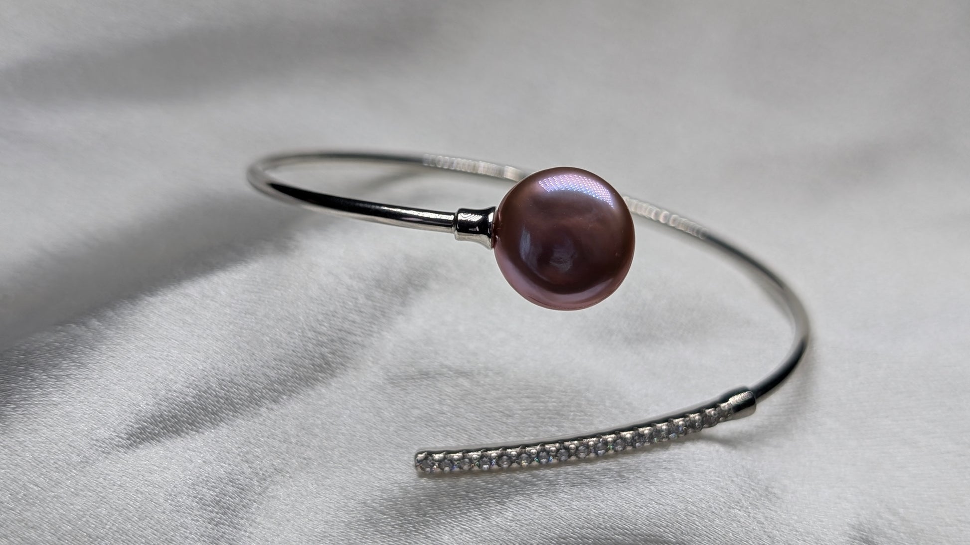 This is an open ended bracelet for easy sizing and is made with sterling silver. The pinkish lavender coin on the end is a genuine pearl shaped coin