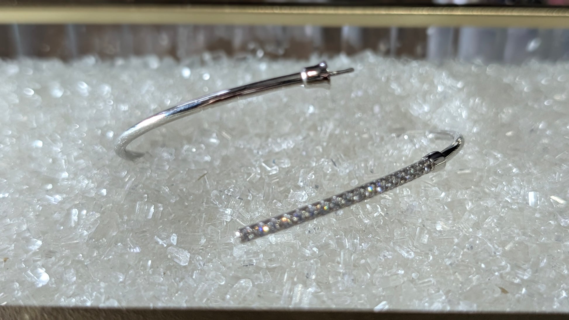 This sterling silver bangle has a run of zirconias on one side and your chosen pearl on the other. The bangle can be adjusted to fit any wrist.